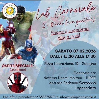 Per Carnevale sono aperte le iscrizioni al nostro laboratorio con tema "supereroi"! Ci sarà anche Deadpool come ospite speciale, per fare tante foto e divertirci insieme, oltre a un momento di merenda condivisa!