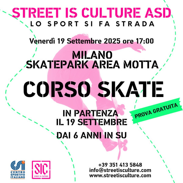 VENERDI' 19 Settembre ORE 17:00 CORSO DI SKATEBOARDING TRIMESTRALE RINNOVABILE, 12 LEZIONI DA 1 ORA ALLA SETTIMANA