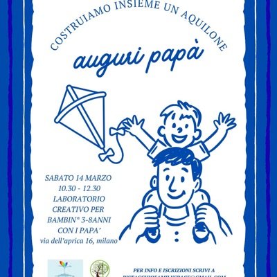Durante l’attività, i bambini costruiranno insieme al proprio papà un colorato aquilone, utilizzando materiali semplici e tanta fantasia. Sarà un’occasione per collaborare, creare qualcosa con le proprie mani e vivere un momento di complicità e gioco.