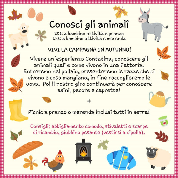 - Attività + PRANZO picnic (IN BASE ALLA DISPONIBILITA’) incluso! 20euro a bambino