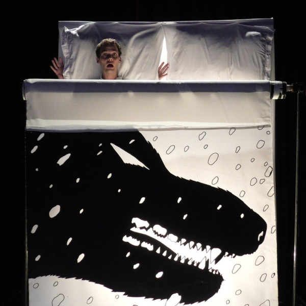 Una storia calda, fatta di luci e di ombre, giocate attraverso il bianco e nero dei dipinti utilizzati nella impattante scenografia. Durante il racconto della storia, ecco illuminarsi le lenzuola del letto e come per magia nascono i disegni. Il lupo, figura minacciosa non solo per i bambini, ha la possibilità di riscattare il proprio ruolo, da sempre considerato un pericolo, e raccontarci le meravigli di questa specie per la quale l’unico vero pericolo… è l’uomo! Loni in questa storia diventa studioso, guardiano, protettore, e angelo custode del lupo salvandogli la vita attraverso un viaggio di formazione nella foresta.